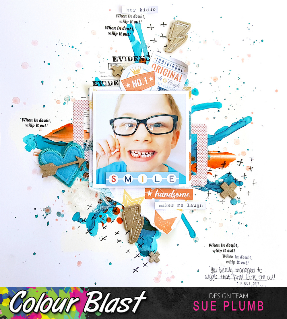 Popping in with my latest design team project for you. Today I have a mixed media scrapbook layout to share that I created for Colour Blast featuring Colour Artist Inks, Colour Paste, Colour Shimmer Spray and Colour Embossing Powder. I made this page to document when one of my boys lost his first tooth.