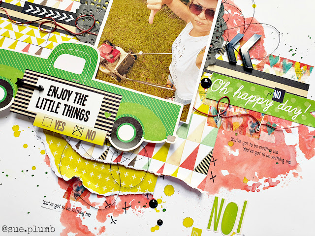 So, back to my challenge. Whilst I was away I had taken some of my older stash to create a stash-busting layout or two. Someone - who shall remain unnamed (Amanda Hartmann! haha) spotted a large green pickup truck on an Echo Park sticker sheet amongst my stash. The truck sticker became a bit of a running joke and it was suggested I use it on a page. Never let it be said that I am one to back down from a challenge - I came home and used that damn sticker!